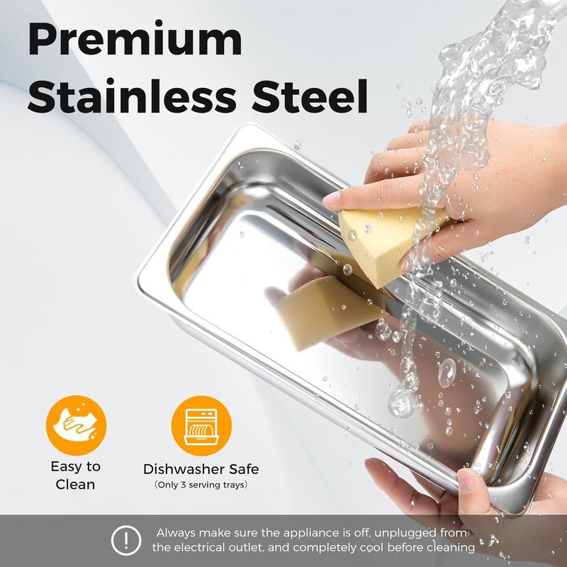 Made from premium stainless steel for long-lasting use. Cleaning is hassle-free: simply wipe the surface with a damp cloth, while the serving trays are dishwasher safe. (Always ensure the appliance is turned off, unplugged, and cooled before cleaning.)
