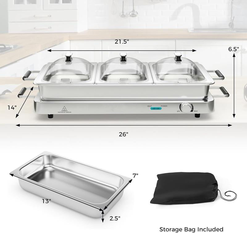 Equipped with 3 serving trays and an 8-quart total capacity, this buffet warmer easily accommodates casseroles, soups, meats, pies, and more—perfect for family gatherings, parties, and events.